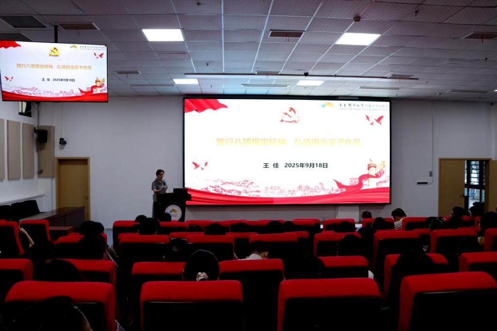 为进一步巩固拓展学习教育成果,持续深化党风廉政建设,锲而不舍落实中央八项规定及其实施细则精神,切实强化党员干部的纪律意识、规矩意识和担当精神。2025年9月18日下午,党委副书记、院长王佳在裙楼1楼阶梯会议室,以《践行中央八项规定精神,弘扬担当实干作风》为题为在家院领导、党支部委员、职能科室全体人员、第三联合党支部全体党员等100余名党员干部群众讲授了一场生动的党课。