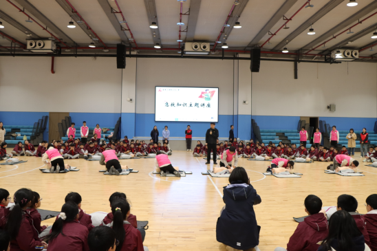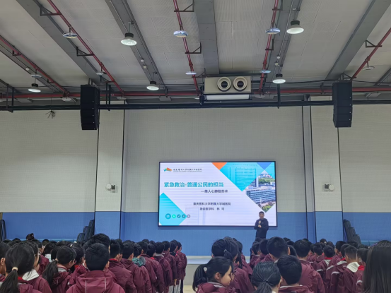 在急救知识培训环节,围绕活动主题,全体师生集中观看了专题片《雷锋精神》,大家聚精会神,认真观看,共同纪念雷锋、学习雷锋。现场,来自重庆医科大学附属大学城医院急诊医学科的林可副主任为同学们进行了心肺复苏理论培训,结合视频和互动提问的形式,让同学们更好地理解和掌握知识要点。在实操展示环节,林可副主任带领6名志愿者以规范标准的动作向同学们进行动作展示。最后,在分班体验环节,同学们踊跃参与,在志愿者们的帮助下,通过实操体验进一步规范动作,深化理解,扎实掌握心肺复苏急救技能。