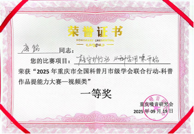 近日,2025年重庆市全国科普月市级学会联合行动-科普作品提能力大赛圆满落幕。我院B17护理团队积极投稿,其中2项(视频类、图文类各1项)进入决赛,视频类科普作品《声音守护行动,从科学用嗓开始》在决赛中脱颖而出,成功斩获一等奖。