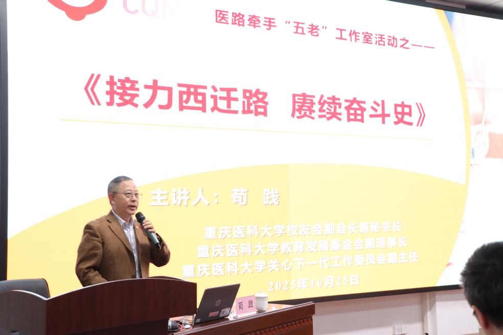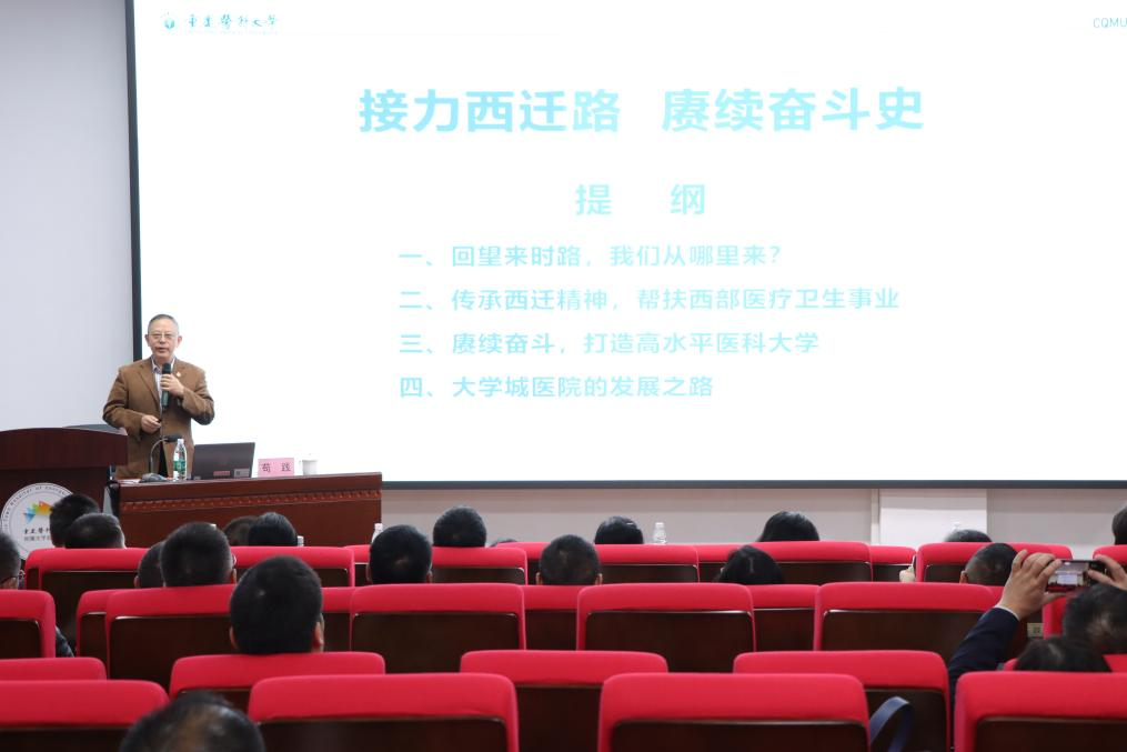 为传承红色医脉、筑牢干部理想信念,10月25日晚,在我院2025年干部培训会期间,重庆医科大学关心下一代工作委员会副主任、校友会副会长兼秘书长、教育发展基金会副理事长苟践受邀为全院干部作“接力西迁路 赓续奋斗史”专题讲座。院领导班子成员、全院中干、党支部委员等共160余人参会,讲座由院党委副书记程刚主持。