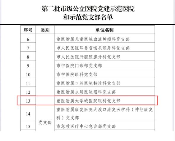 近日,重庆市医院党建工作指导委员会办公室公布第二批市级公立医院党建示范党支部名单,我院眼科党支部成功入选。这一殊荣的获得,充分彰显了眼科党支部在以党建引领学科发展、服务群众眼健康方面所发挥的标杆示范作用,为全院党建工作树立了榜样。