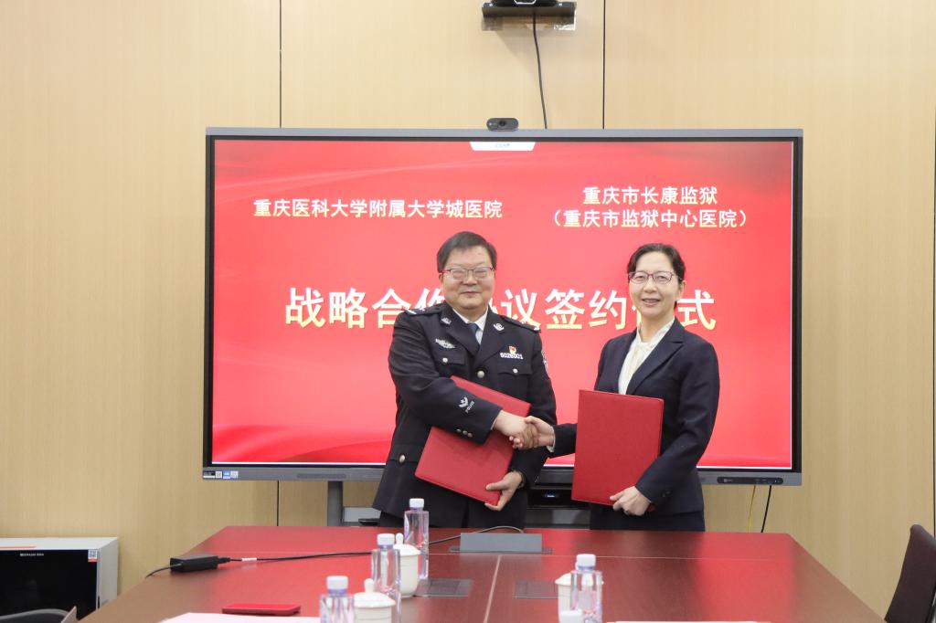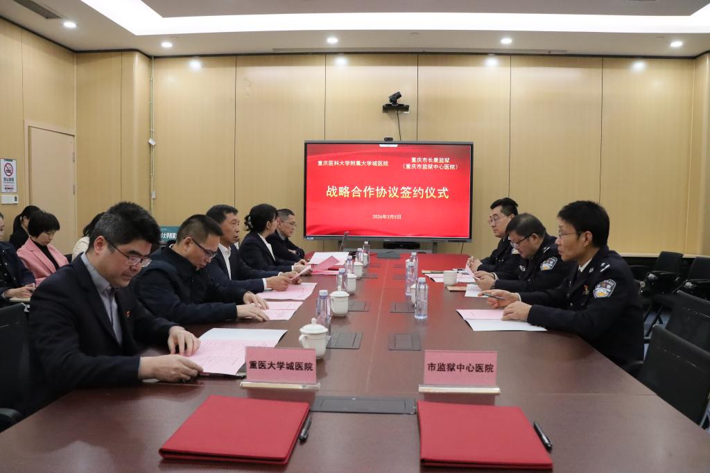 2026年3月5日上午,重医附属大学城医院与重庆市长康监狱(重庆市监狱中心医院)战略合作签约仪式在重医附属大学城医院成功举行。双方党政主要负责人、院领导及相关科室负责人出席仪式。