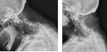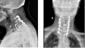 术后,患者颈部剧烈疼痛及右肩右上肢放射疼痛立即减轻,一周后,颈部疼痛及右上肢放射痛消失,脊柱形态得到显著改善,已能重新直立站立行走。