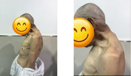 术前图,患者因骨折疼痛与脊柱畸形,颈部活动明显受限,体态呈现明显异常: